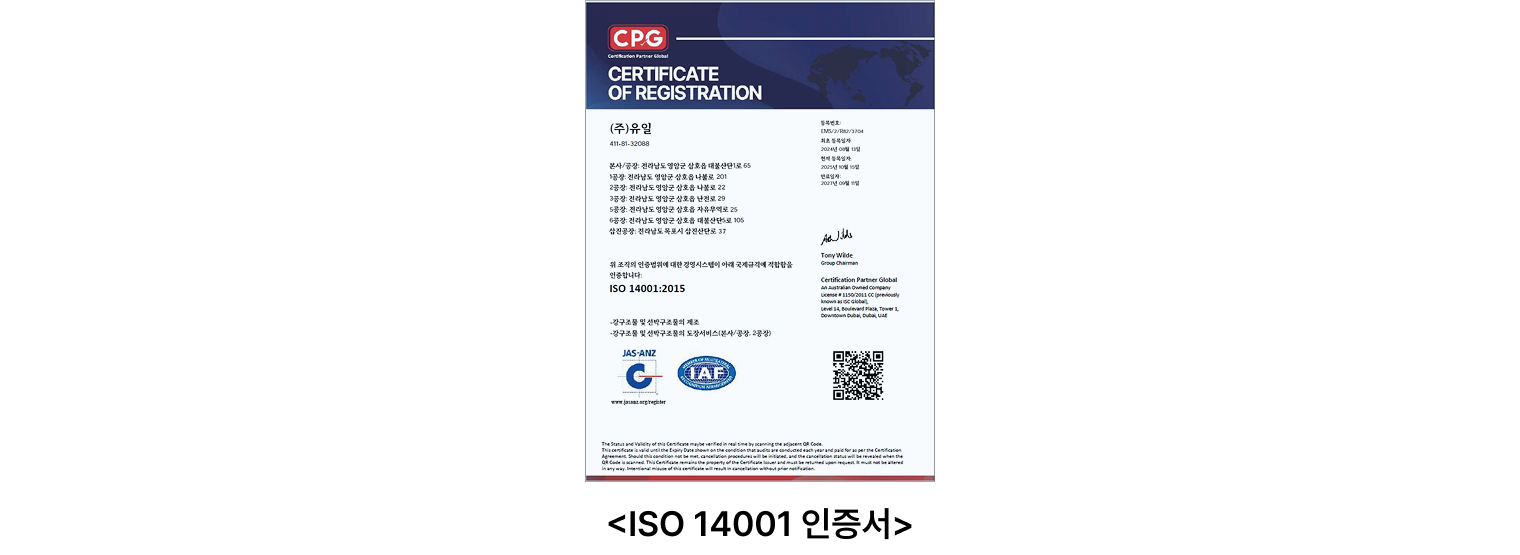 유일은 글로벌 기업으로서 사업활동으로 인한 환경영향을 최소화하기 위해 체계적인 환경경영을 실천하고 있습니다.